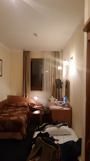 I was actually an hour early for my check-in but the lady behind the counter, Klaudia, was very accommodating. I'll spare you the picture of the bathroom (quite nice actually) but the interesting part is the room itself. I could actually take a portrait picture and give a better sense of it's size that with a landscape picture. I'd call it cozy. But the bed on the left is very comfortable and I look forward to trying it out after trying out the shower.